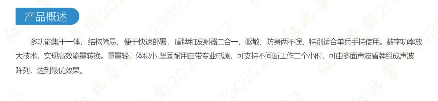多功能集于一體,結構簡易,便于快速部署,盾牌和發射器二合一,驅散、防身兩不誤,特別適合單兵手持使用。數字功率放大技術,實現高效能量轉換。重量輕,體積小堅固耐用自帶專業電源,可支持不間斷工作二個小時,可由多面聲波盾牌組成聲波陣列,達到最優效果。